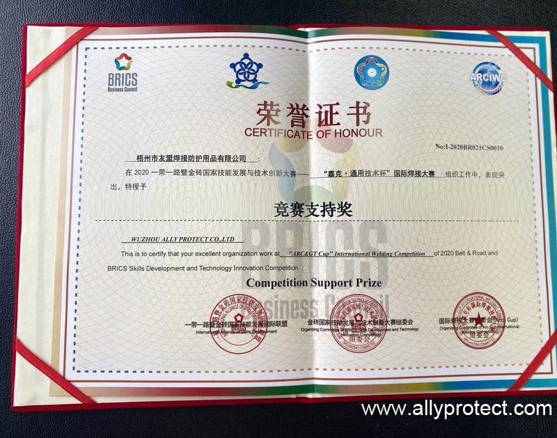 梧州市友盟焊接防護用品有限公司榮獲2020年一帶一路暨金磚國家技能發(fā)展與技術(shù)創(chuàng)新大賽競賽支持獎。AP友盟將不遺余力的支持國家一帶一路發(fā)展的宏偉戰(zhàn)略。